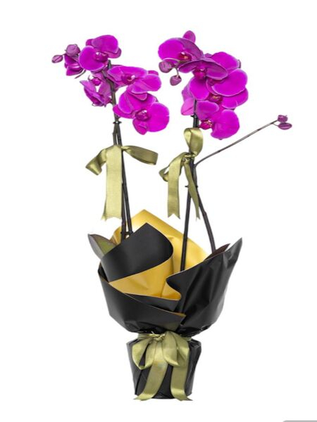 Çiftli mor orkide siyah kağıt ile sade ve şık bir şekilde tasarlanmıştır.