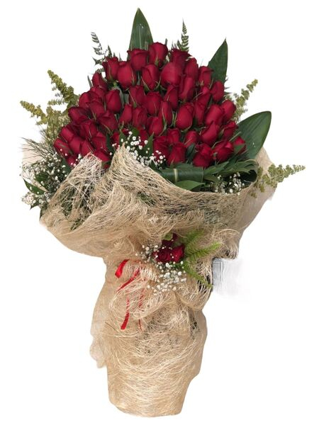 41 adet kırmızı gül yeşillikler ile tasarlanmış hasır süsleme ile süslenmiştir.