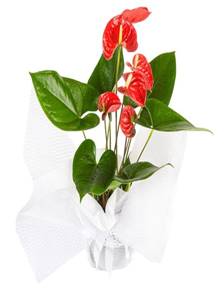 Antoryum saksı çiçeği beyaz elyaf ile süslenmiştir.